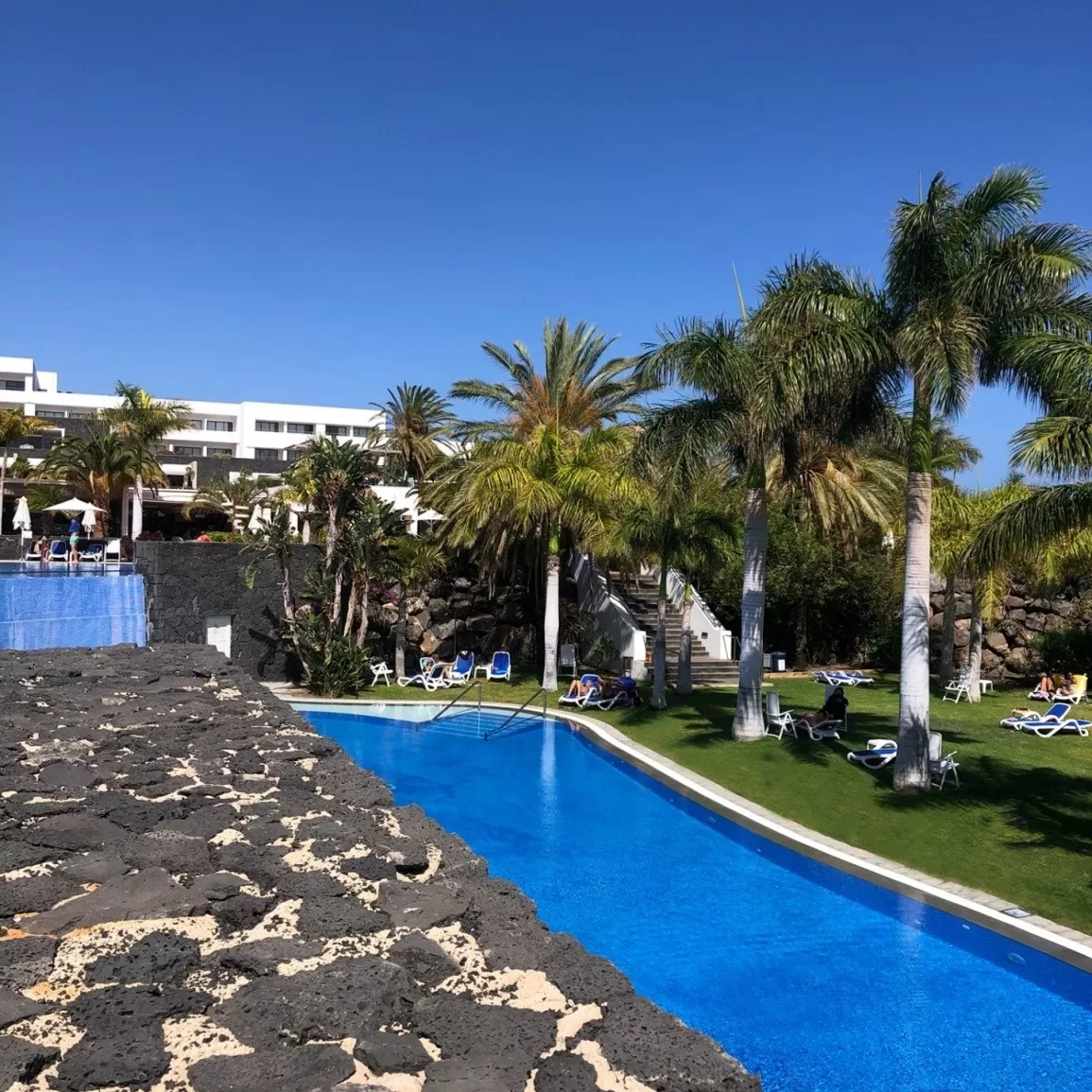 Un espace entouré d’arbres luxuriants et de palmiers qui donne sur la piscine, avec une terrasse.